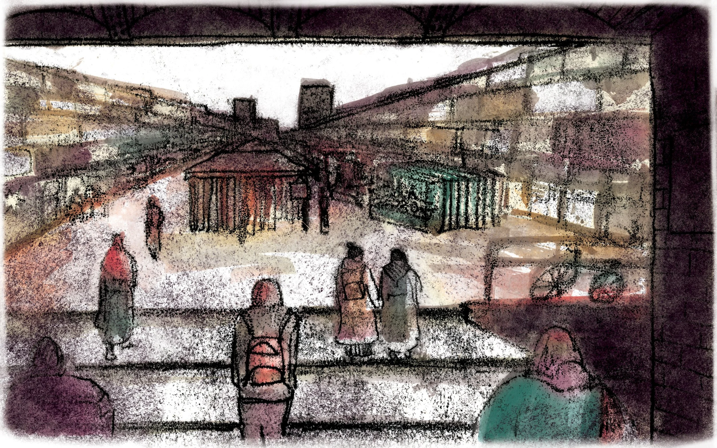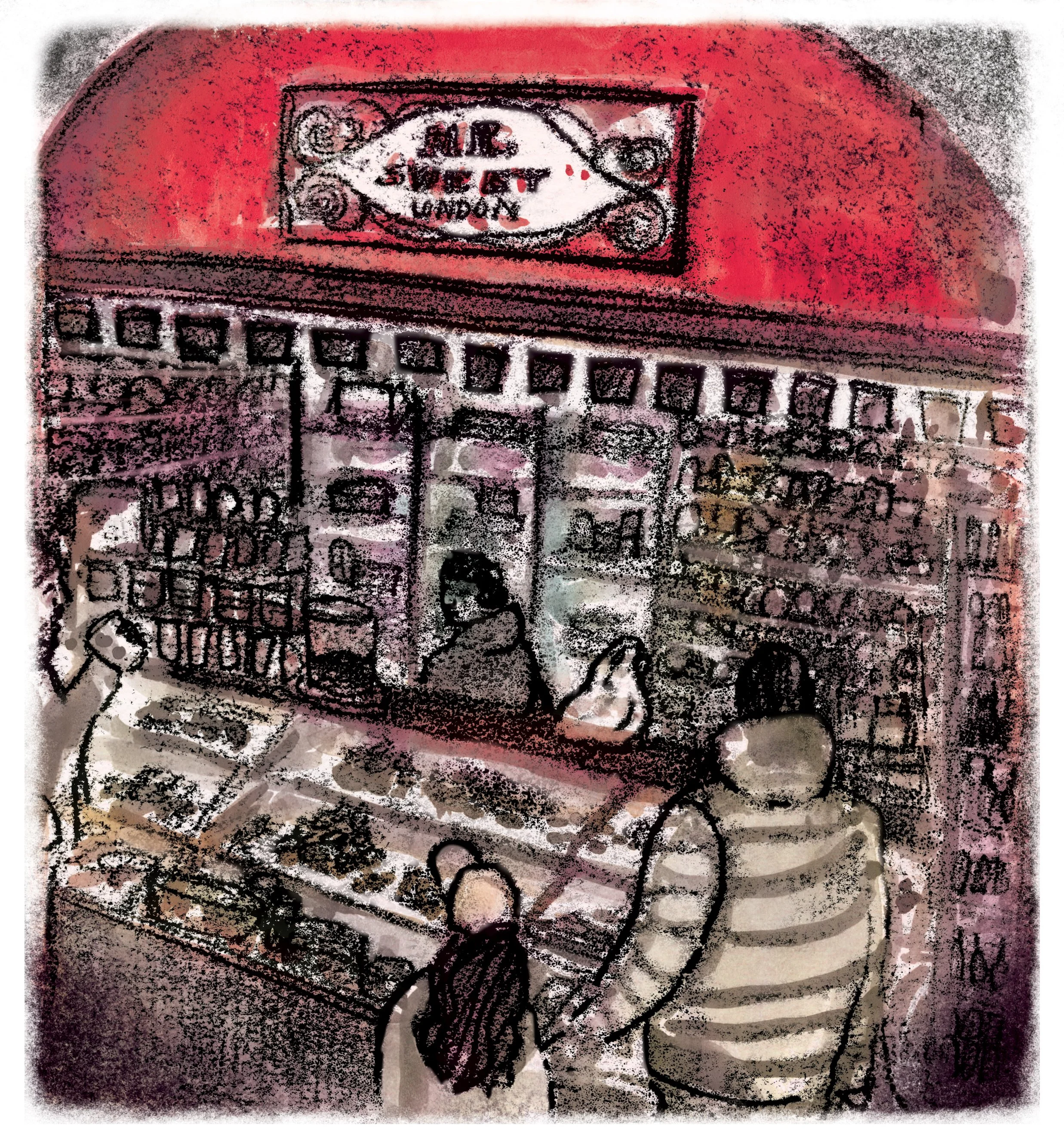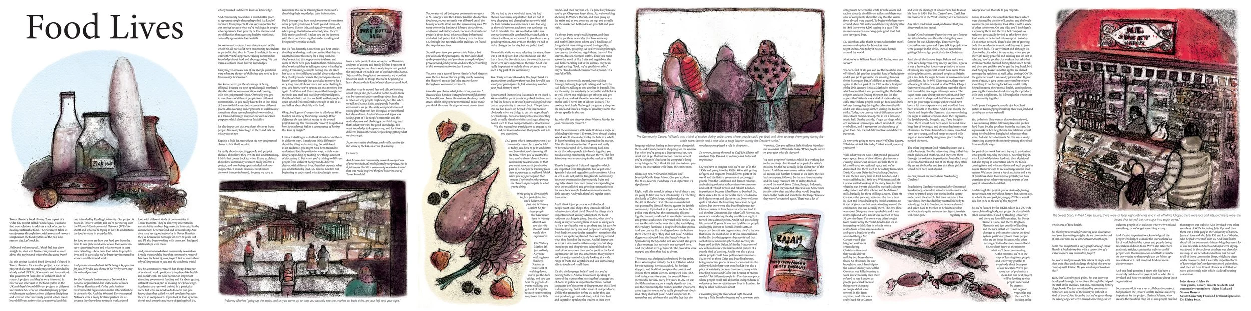 Inspired by an audible food history tour of the area recently made by the organisation, I responded to the brief through a variety of food and reportage illustrations to accompany the podcast’s transcript in an editorial setting. Here I worked in monoprint and ink to depict a mixture of foods described in the text and those I had observed in person. Further interviews and drawings can be seen on the wen.org.uk website